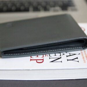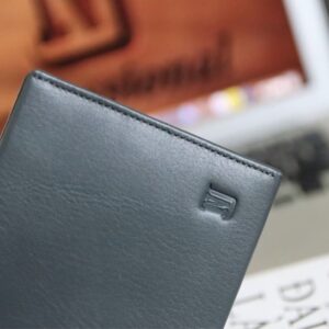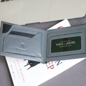 Ví ngang da bò màu xám, được làm bằng da bò nguyên miếng ,công nghệ thuộc da tiên tiến,tạo cảm giác êm dịu khi sử dụng, lớp lót jacquard biểu tượng  với vòng hoàn thiện bằng, có 1 túi xem, 6 túi cho thẻ tín dụng, có 2 ngăn để tiền giấy, không có khoá kéo.